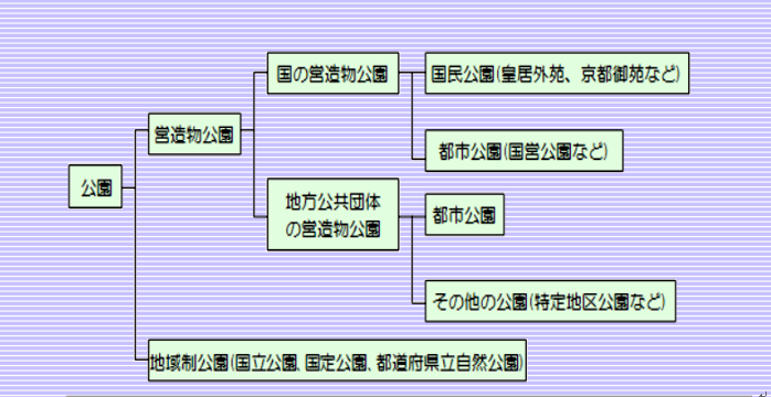 一般に『公園』と呼ばれるものは、『営造物公園』と『地域制公園』とに大別される。 営造物公園は都市公園法に基づく都市公園に代表され、国又は地方公共団体が一定区域内の土地の権原を取得し、目的に応じた公園の形態を創り出し一般に公開する営造物である。地域制公園は自然公園法に基づく自然公園に代表され、国又は地方公共団体が一定区域内の土地の権限に関係なく、その区域を公園として指定し土地利用の制限・一定行為の禁止又は制限等によって自然景観を保全することを主な目的としている。