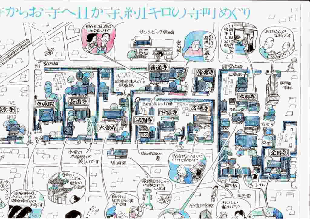 阪神本線尼崎駅の南西に位置し、多くの仏教寺院が密集している。