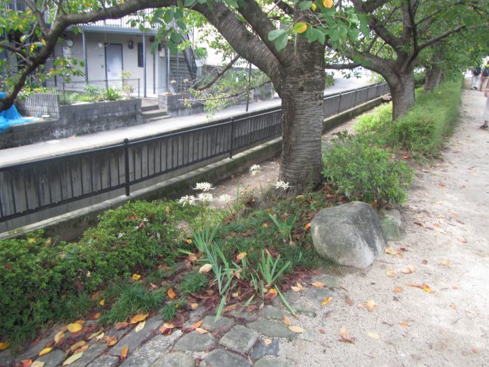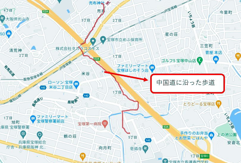 現地は中国道で寿町から分断されており、一番の近道は売布駅でおりてから宝塚方面に歩き中国道にあたるのでそれを越えると中国道に沿って歩道がありその歩道を大阪方面に歩けば、行き止まりになり、そこを右折して行けば車は通れないが、大堀川にかかる橋があり、それを越えると小浜に到着することがことがわかった。この道は畑の道であるので現地の方でないとわからない。