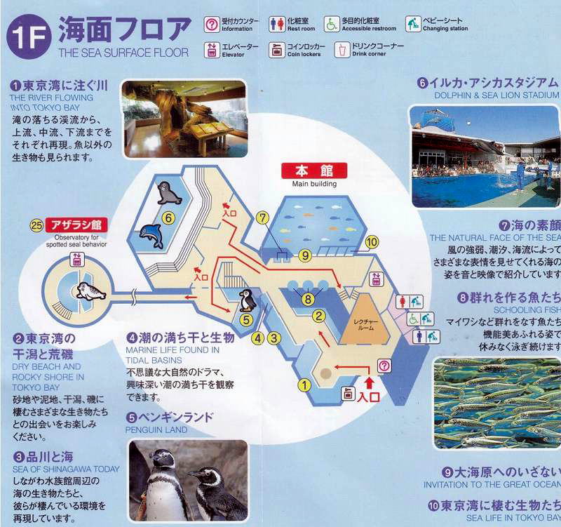 地上一階地下二階建て。一階の「海面フロア」では東京湾の魚や生物などを展示、スタジアムではイルカ・アシカのショーが開催される。地下の「海底フロア」では巨大なトンネル水槽を通ることができる。また、水族館の外部にはレストラン「ドルフィン」とマリンショップ「シーガル」がある。
