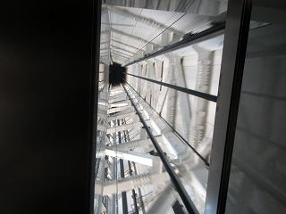 | 天望デッキ(350m)から下を望む | 天望回廊に行くエレベーターは上が透けて見える | |