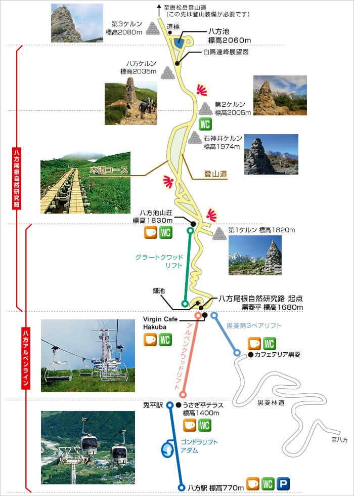 八方アルペンラインの終点、八方池山荘から標高2,060mの八方池までの約2.5kmは、木道・階段等で整備された トレッキングルート「八方尾根自然研究路」となっており、沿道は特殊な地質がもたらす希少な植物の宝庫です。