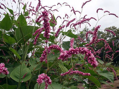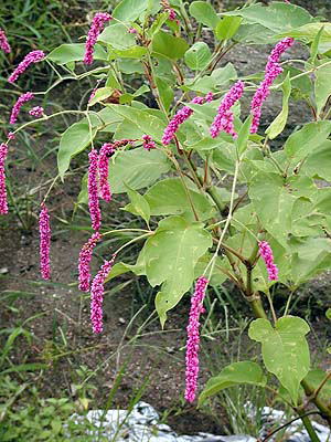 オオケタデ は大型の1年草であり、高さ2m近くになる。アジア原産の帰化植物であり、元々は薬草として導入されたものが河原などに野化している。よく見られるのは農家の庭先や畑の一隅などであり、花が美しいので栽培されている。薬草としてはポルトガルから入ったとのことで、マムシの毒消しになるのでハデコブラと呼ばれ、オオケタデの別名となっている。マムシの毒を解毒できるかどうかは定かでないが、化膿性の腫れ物や毒虫に刺されたときの民間薬として利用されており、畑の一隅に栽培されていることが多いのも、このためもあるかと思う。別名としては、ハデコブラの他、オオベニタデの呼び名もある。オオケタデは大きくて毛が多いことによる。 |