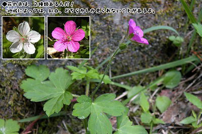 | ゲンノショウコ、科名(フウロソウ)、生薬名(玄草)、薬用部位(全草)、薬効(下痢止、健胃) | |