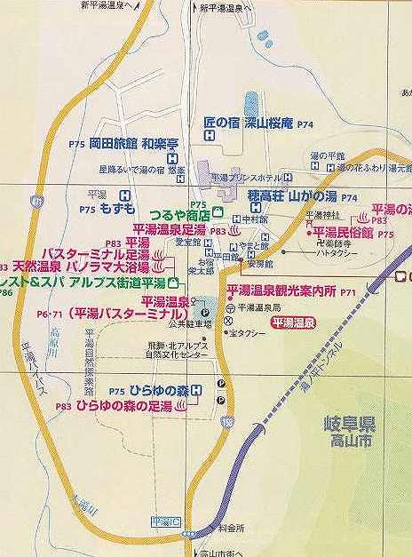 安房トンネル出口、平湯インターチェンジ付近の平湯バスターミナルより、国道158号安房峠方面に温泉街が広がる。バスターミナルにも日帰り入浴施設を備える。平湯インターチェンジ側から温泉街に入ってくる入り口には、日帰り入浴施設の敷地に「森の灯台」という灯台を模した建築物が存在する(2005年に完成)。灯台の下には足湯も存在する。