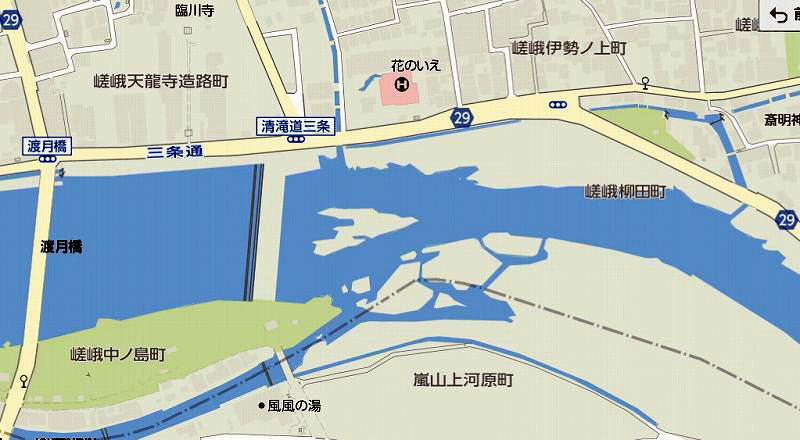 本来地名としては西京区(桂川の右岸)を指し、左岸は右京区嵯峨であるが、観光案内等では嵯峨地区を含めた渡月橋(とげつきょう)周辺全域を一まとめに嵐山と称する事が多いため、本記事では渡月橋周辺全域をしての嵐山を扱う。