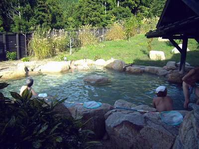 | また室生火山群の山麓に開けた曽爾高原温泉 「お亀の湯」は 源泉は46.3℃(気温9℃)、ph8.6のアルカリ性ナトリウム‐炭酸水素塩泉。ツルヌル美人の湯だ。 |