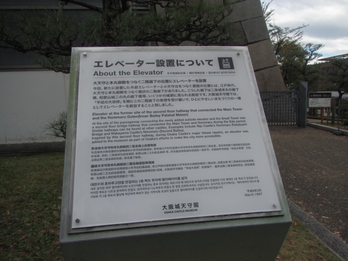 2022年11月20日に行きました。エレベーターについては健常な方については通常1Fから5Fまで上り専用でいけます。5Fから8F(最上階)までは歩きのみです。下りは8階から1Fまで歩きのみです。車椅子やお体の不自由な方については上り(8階)までも下りもエレベーターが使えるとのことです。エレベーター設置について(現地の看板より) 大阪城天守閣では、どなたも安全かつ手軽に登閣していただけたけるよう、天守台西側にエレベーター1基を新設いたしました。これは「大阪市ひとにやさしいまちづくり」の一環として設置したものです。なお、このエレベーターの設置場所は、もともと大天守と本丸御殿をつなぐ橋状の廊下があったところで、このたびの新設にあたってはこの廊下の発想を受け継ぎました。