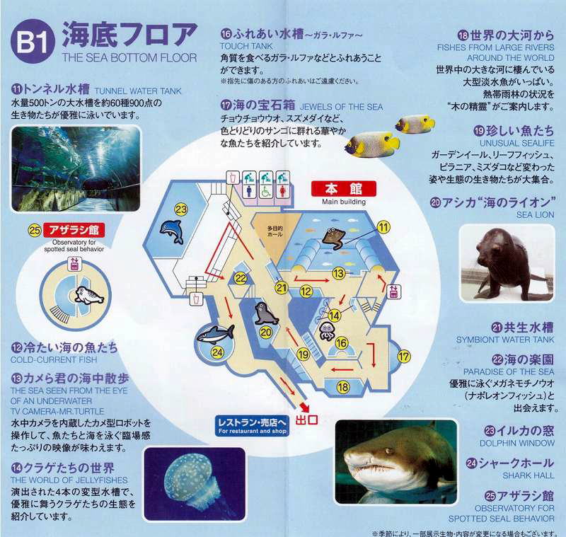 地上一階地下二階建て。一階の「海面フロア」では東京湾の魚や生物などを展示、スタジアムではイルカ・アシカのショーが開催される。地下の「海底フロア」では巨大なトンネル水槽を通ることができる。また、水族館の外部にはレストラン「ドルフィン」とマリンショップ「シーガル」がある。