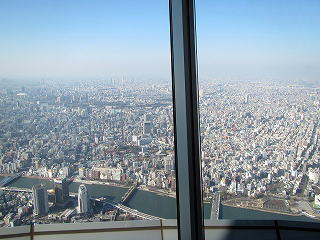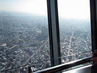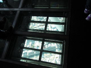 | 天望デッキ(350m)から下を望む | 天望回廊に行くエレベーターは上が透けて見える | |